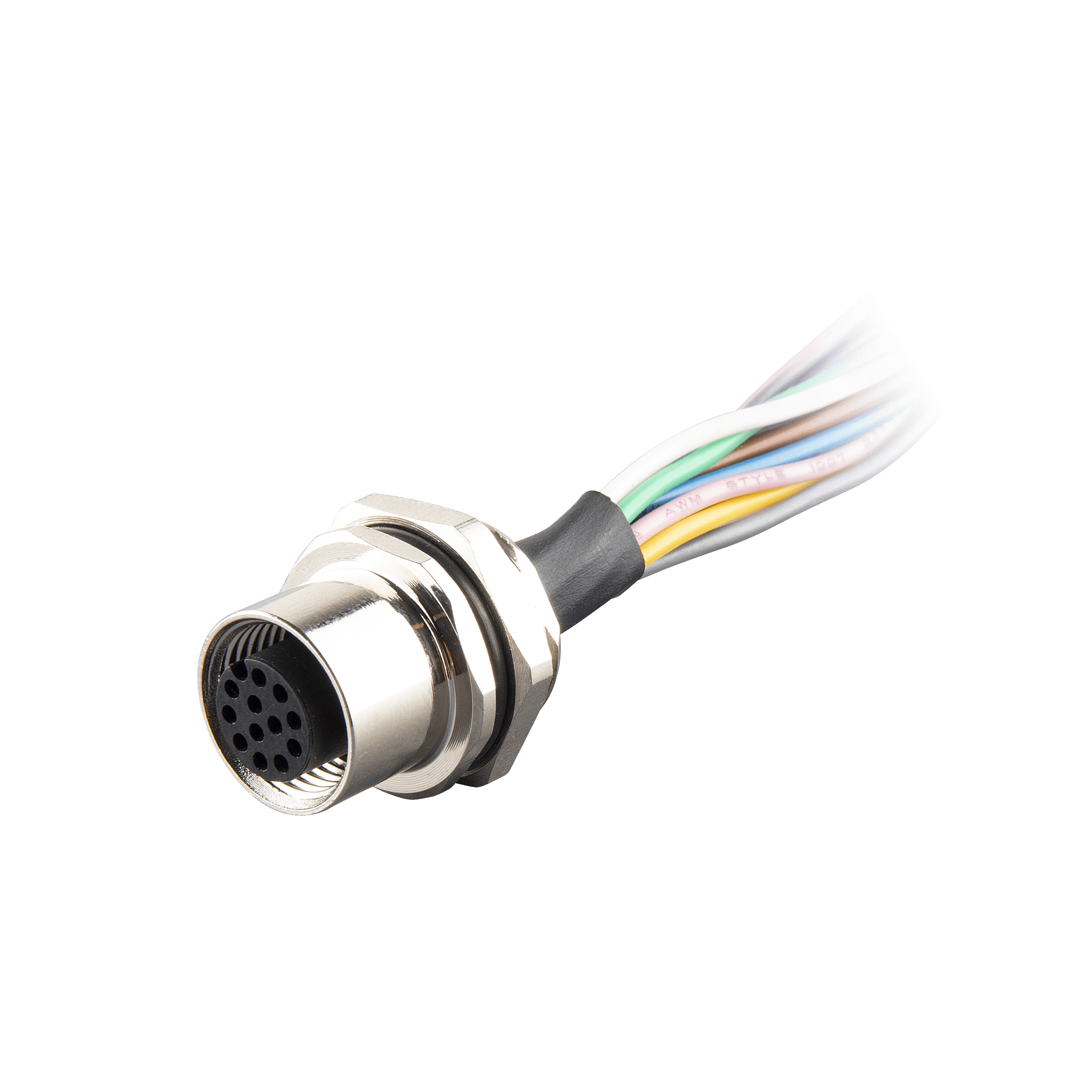 Flange-Mount Bulkhead Connector, with cable, m12 A-code 12-pin Straight Female, m16 Hole dimension, Rear mount, with PVC Cable, 2 m